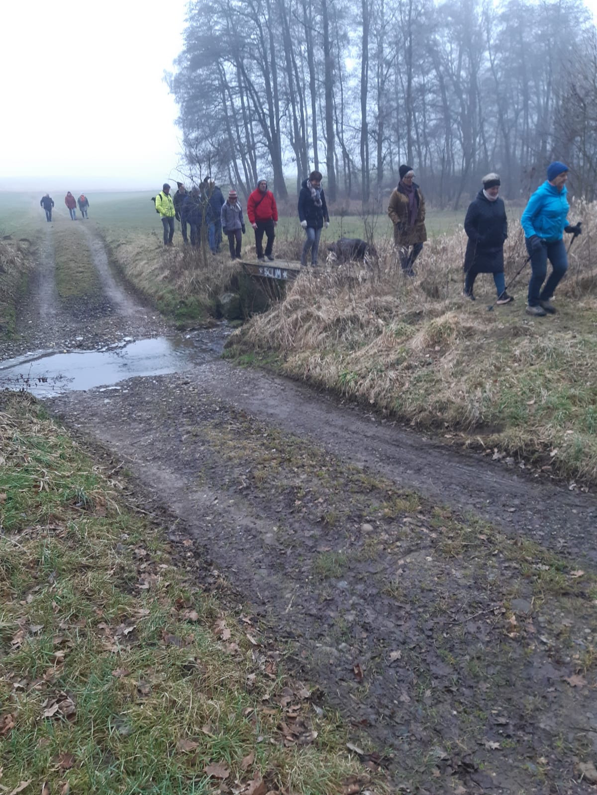 Die Dorfgemeinschaft Wennedach lud am Sonntag, den 25. Januar zu einer Winterwanderung ein. Gegen 13.00 Uhr fanden sich 20 Wanderinnen und Wanderer sowie ein Hund beim Wasserreservoir oberhalb von Reinstetten ein. Nach einer kurzen Begrüßung von Wanderführer Siggi Wehrle ging es los. Am westlichen Waldrand des Schachens entlang führte der Weg hinauf zum höchsten Punkt der Strecke, 625 Meter hoch. Ein dickes Nebelgrau verdeckte die schöne Aussicht, die man sonst von hier oben hat. Siggi Wehrle erklärte, welche Berge der Alpen man bei guter Sicht sehen kann. Von hier aus ging es hinunter ins Laubachtal. Hier gibt es eine Furt und einen Steg über die Laubach. Über gefrorene Wiesen wurde eine Gedenkstätte am Waldrand erreicht. 3 junge Soldaten mussten hier in den letzten Tagen des 2. Weltkriegs nach einem Luftkampf ihr Leben lassen. Nach einer weiteren halben Stunde Wegstrecke erreichte man Gutenzell. In der Klosterkirche bekamen wir eine ausführliche Erklärung von Maria Dörner über die verschiedenen Szenen der berühmten Gutenzeller Krippe. Im Anschluss waren alle froh, von der kalten Kirche in den beheizten Raum des Kapitelsaals zu kommen. Bei Kaffee und Zopfbrot genossen wir die Pause. In der Zwischenzeit fing es draußen kräftig an zu schneien und der Rückweg zum Ausgangspunkt fand bei Schneetreiben in einer winterlichen Landschaft statt. Trotz der widrigen Bedingungen lobten alle die Wanderung.